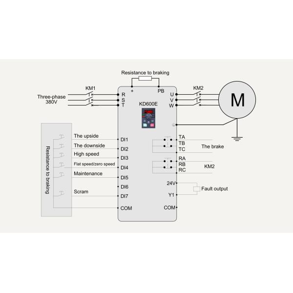 KD600E series elevator inverter can support the emergency UPS power supply operation for emergency power outage operati-on, and the emergency signal can be received by the inverter terminal DI6. The wiring diagram is as follows: